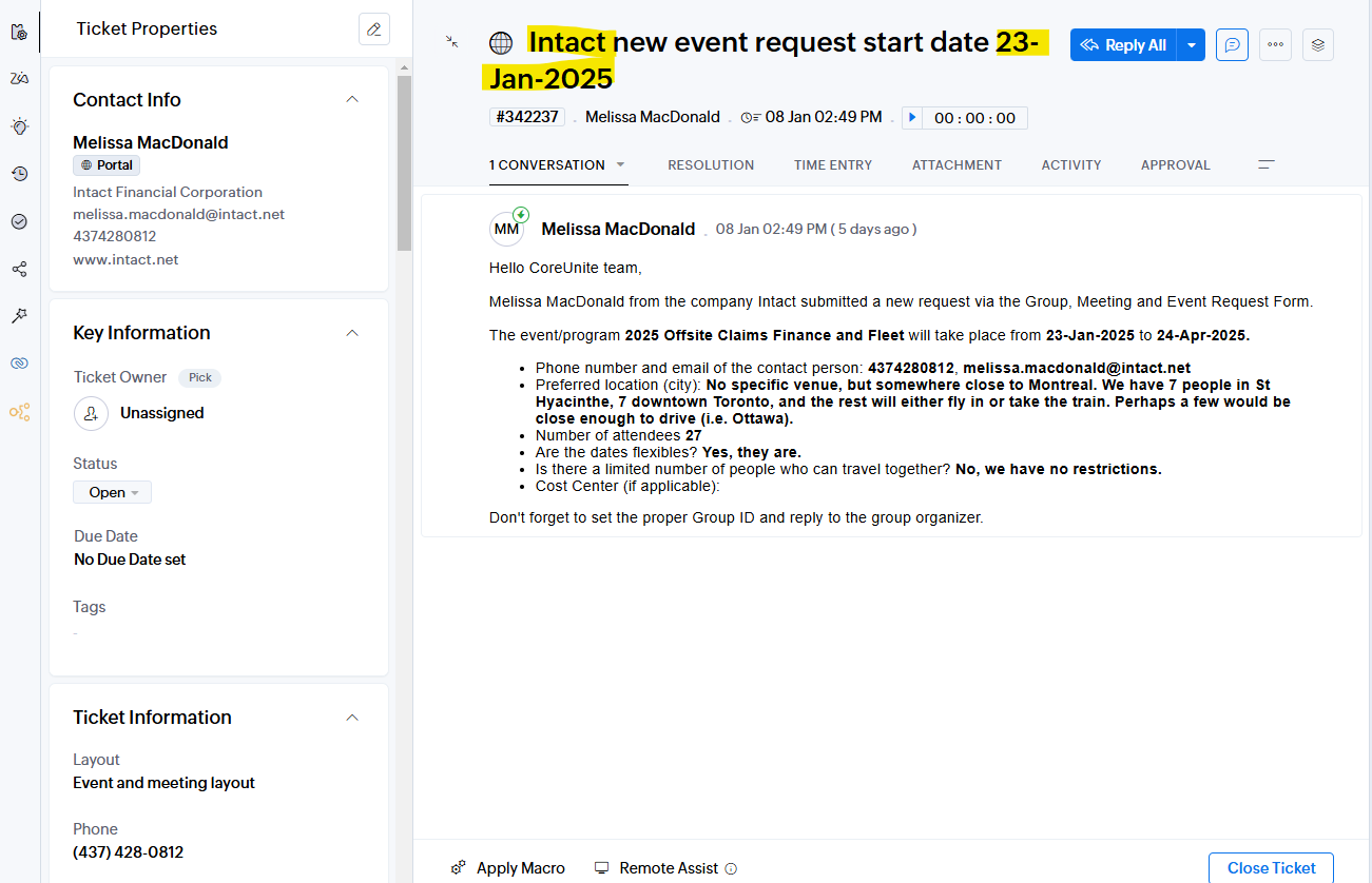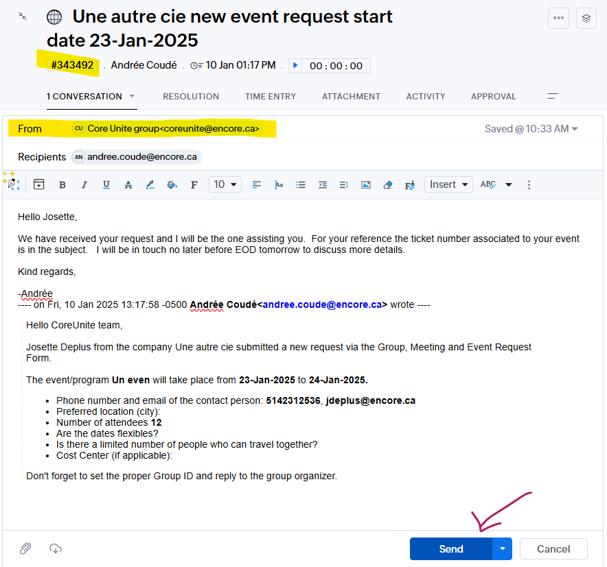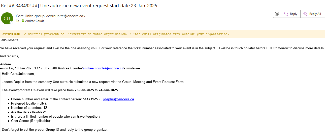 Once the Group ID has been entered, you may want to reply to the group organizer (by clicking on Reply All in the conversation window) to provide them with the ticket number associated to the main ticket of the event.